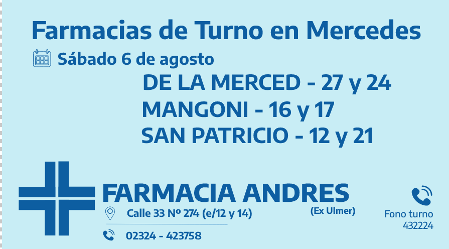 Desde las 8:30 del día de hoy hasta la misma hora de mañana, las famacias de turno en Mercedes son: De la Merced, Mangoni y San Patricio.