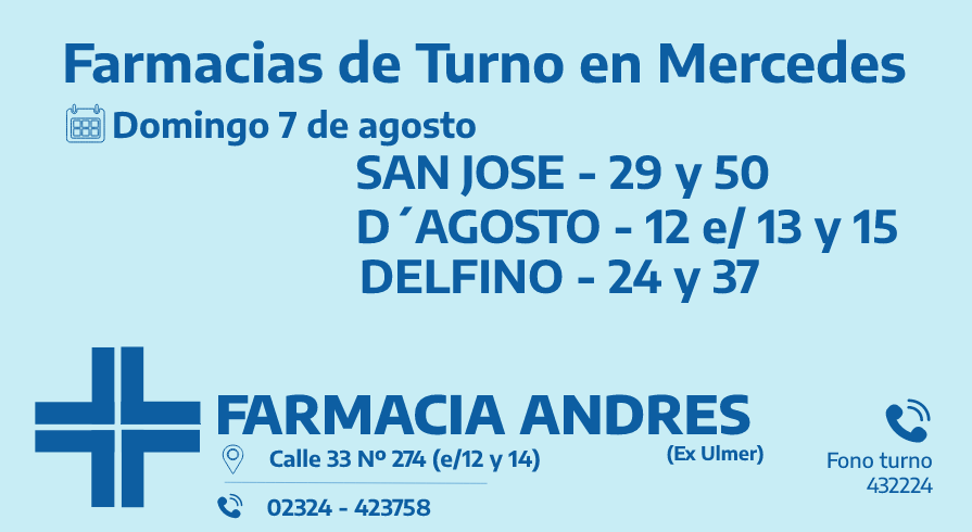 Desde las 8 30 del día de hoy hasta la misma hora de mañana las farmacias de turno en Mercedes son: San José, D’Agosto y Delfino.