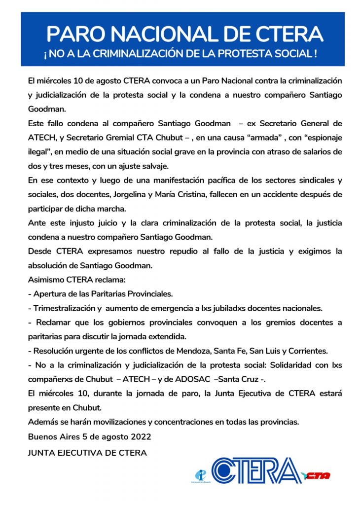 Asimismo se manifiesta en disconformidad con la Judicialización de dirigentes sindicales que luchan por derechos legítimos para el conjunto de trabajadores que representan. Expresa su solidaridad con el docente y dirigente Santiago Goodman, de Atech Chubut. También el FUDB se suma a la petición de su absolución.