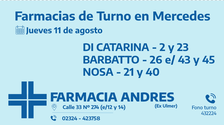 Desde las 8:30 del día de hoy hasta la misma hora de mañana las farmacias de turno en Mercedes son: DiCatarina, Barbatto y Nosa.