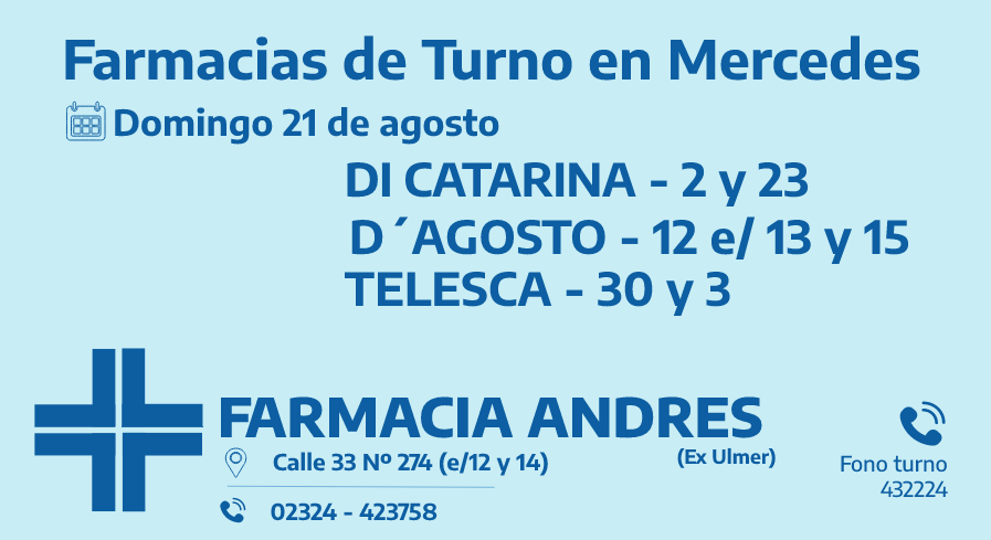 Desde las 8:30 del día de hoy hasta la misma hora de mañana, las farmacias de turno en Mercedes son: Di Catarina, D’Agosto y Telesca.
