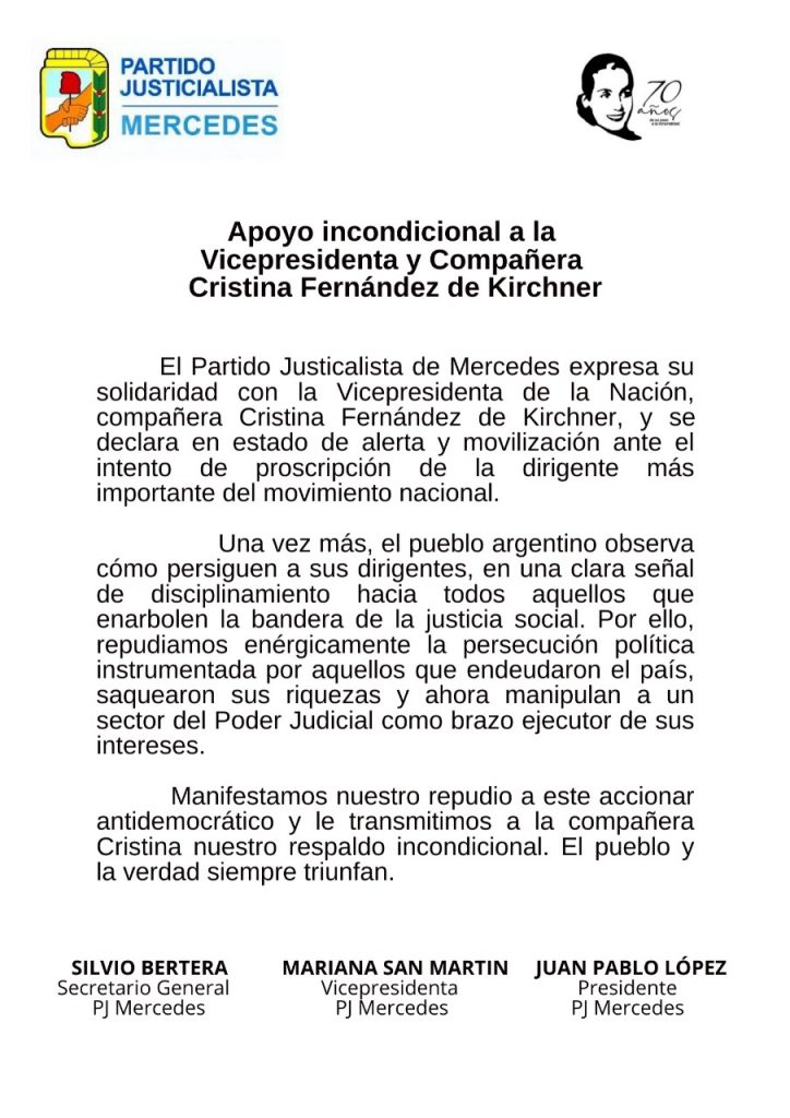 El Partido Justicialista Mercedes expresa su solidaridad con la Vicepresidenta de la Nación, compañera Cristina Fernández de Kirchner, y se declara en estado de alerta y movilización ante el intento de proscripción de la dirigente más importante del movimiento nacional.
