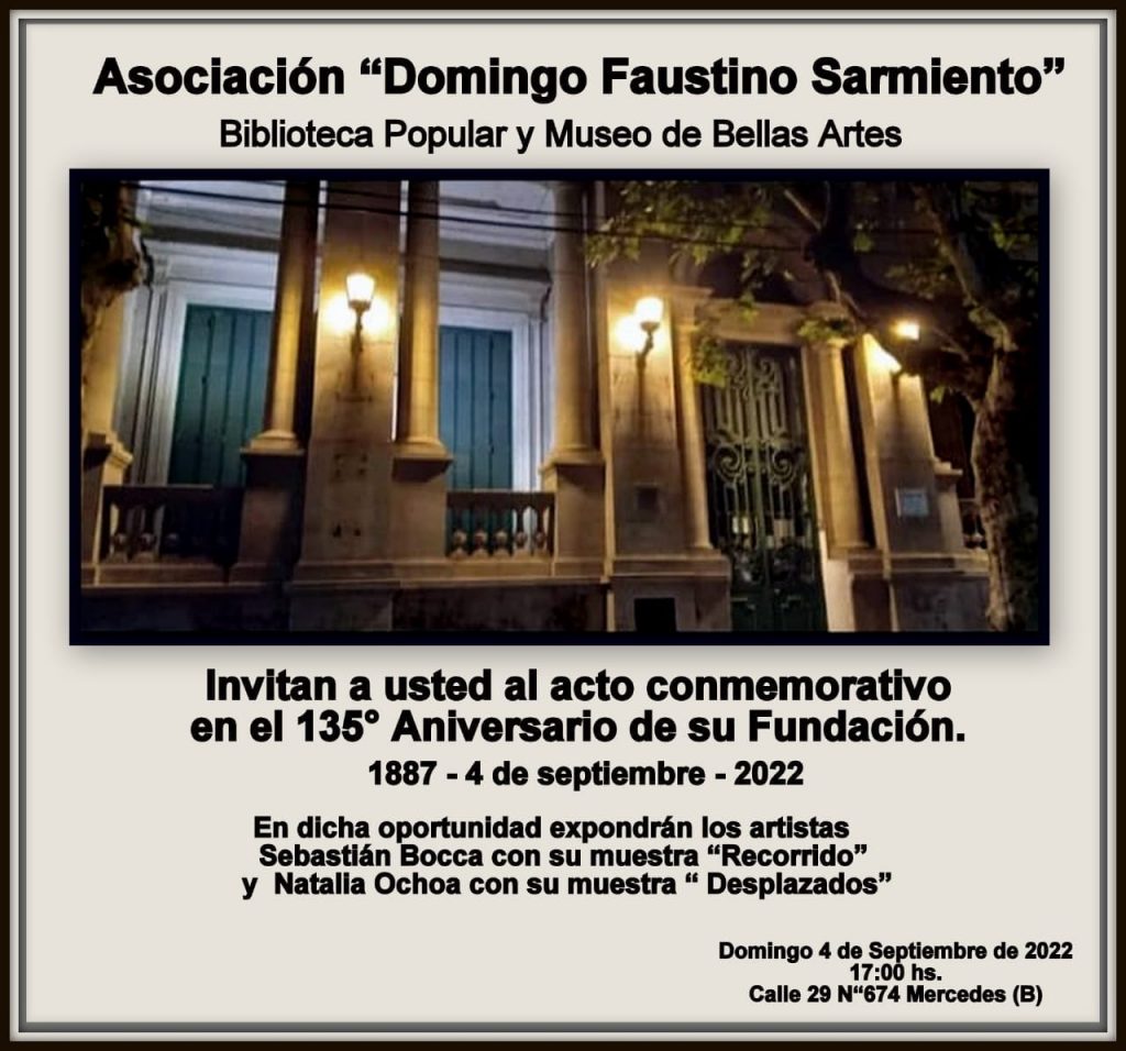 El venidero domingo 4 de septiembre la Biblioteca Sarmiento celebra sus 135 años. A partir de la hora 17 del día domingo, serán los festejos de la institución con un acto que tendrá como epicentro la inauguración de las muestras de pinturas de Natalia Ochoa y Sebastián Bocca.