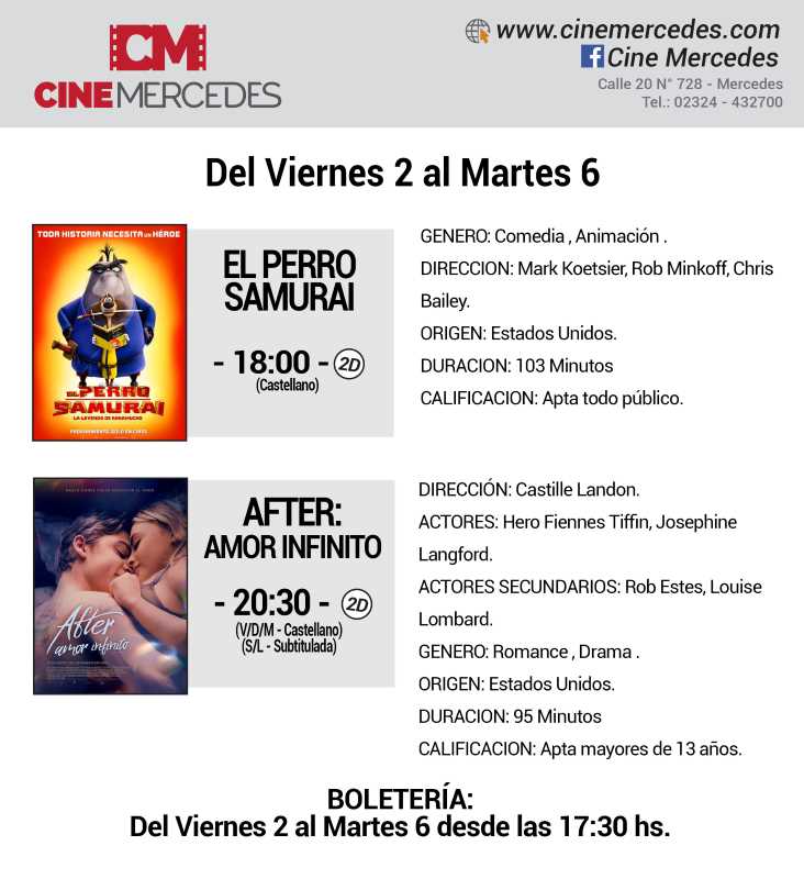 Desde este viernes 2 de septiembre, hasta el martes 6, el Cine Mercedes proyectará dos películas. La primera, una comedia de animación, «El Perro Samurai», podrá verse en las funciones de la hora 18. En tanto, en las funciones de las horas 20:30 podrá verse «After: Amor Infinito», un drama romántico.