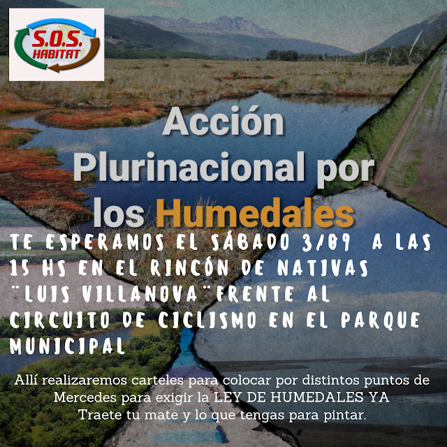 Este sábado 3 de agosto, a partir de la hora 15, la asociación civil S.O.S. Hábitat estará llevando adelante su acción local en el marco de las actividades plurinacional por los humedales. En el sector nuevo del Parque Municipal, donde está rincón de nativas, realizarán carteles para colocar en diferentes puntos de la ciudad.