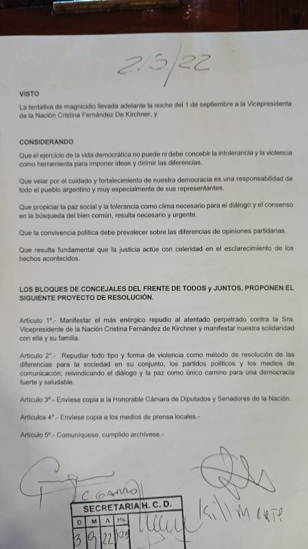 Artículo 1º.- Manifestar el más enérgico repudio al atentado perpetrado contra la Sra. Vicepresidente de la Nación Cristina Fernandez de Kirchner y manifestar nuestra solidaridad con ella y su familia.