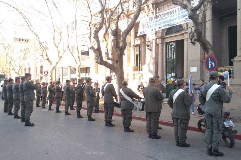 En la vereda de la Biblioteca Sarmiento de Mercedes se llevó adelante el acto central por los 135 años de la institución. Sobre la Avenida 29, la banda de Gendarmería Nacional musicalizó la celebración que incluyó un brindis por parte de los integrantes de la Comisión Directiva, la muestra pictórica de Natalia Ochoa y Sebastián Bocca y la muestra de filatelia de Analía Sosa y Alejandro Molle.