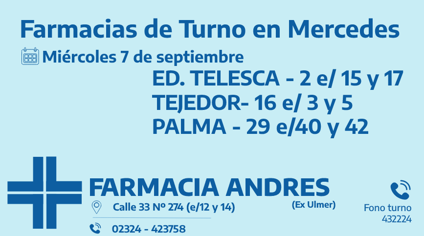 Desde las 8 30 del día de hoy hasta la misma hora de mañana las farmacias de turno en Mercedes son Eduardo Telesca, Tejedor y Palma