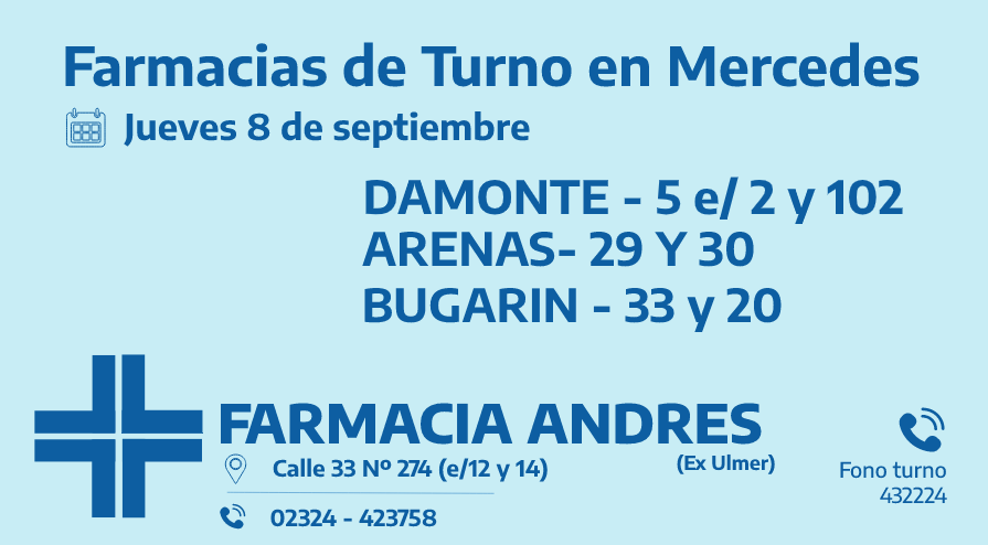 Desde las 8:30 del día de hoy hasta la misma hora de mañana, las farmacias de turno en Mercedes son: Damonte, Arenas y Bugarín.