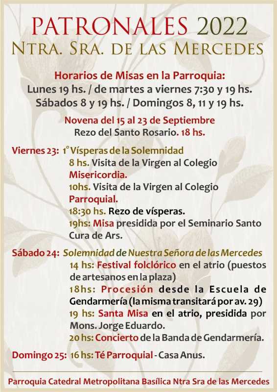 El Párroco de la Basílica Catedral de Mercedes, Juan Carlos Bouzou, invita a los feligreses a participar del cronogramas de ceremonia previa al Día de la Vírgen de las Mercedes, el 24 de septiembre. La Novena será entre el 15 y el 23 de septiembre, y desde ese día, durante el fin de semana, habrá distintas actividades durante los días.