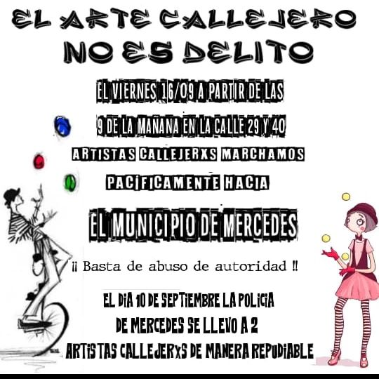 En la noche del sábado, una pareja de artistas callejeros fueron aprehendidos. Hasta el lunes al mediodía estuvieron en la comisaría hasta que fueron indagados por la Fiscalía. Mientras tanto, sus colegas estuvieron en la puerta de la Policía de calle 37 para reclamar y denunciar «violencia institucional y abuso de poder» por parte de los agentes policiales. El viernes 16, 9 horas, marcharán hasta el municipio proclamando: «El Arte Callejero No es Delito».