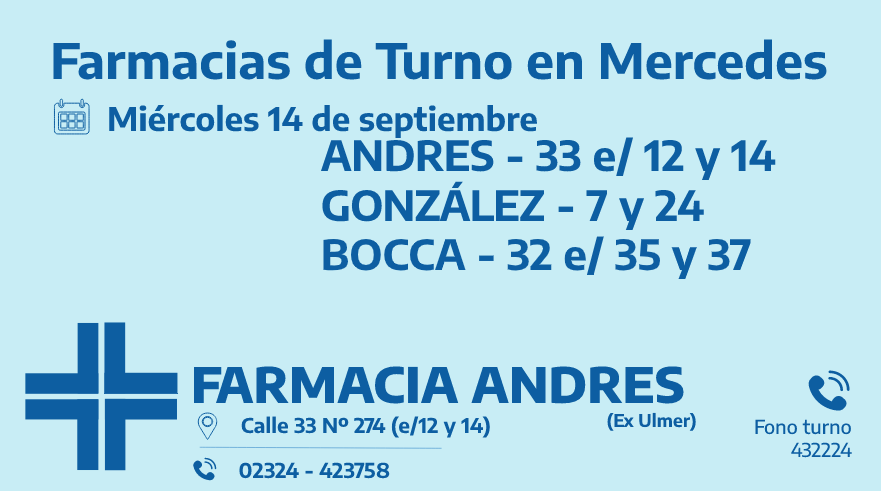Desde las 8:30 del día de hoy hasta la misma hora de mañana, las farmacias de turno en Mercedes son: Andrés, González y Bocca.