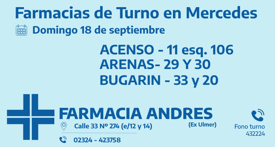 Desde las 8:30 del día de hoy hasta la misma hora de mañana, las farmacias de turno en Mercedes son: Acenso, Arenas y Bugarín