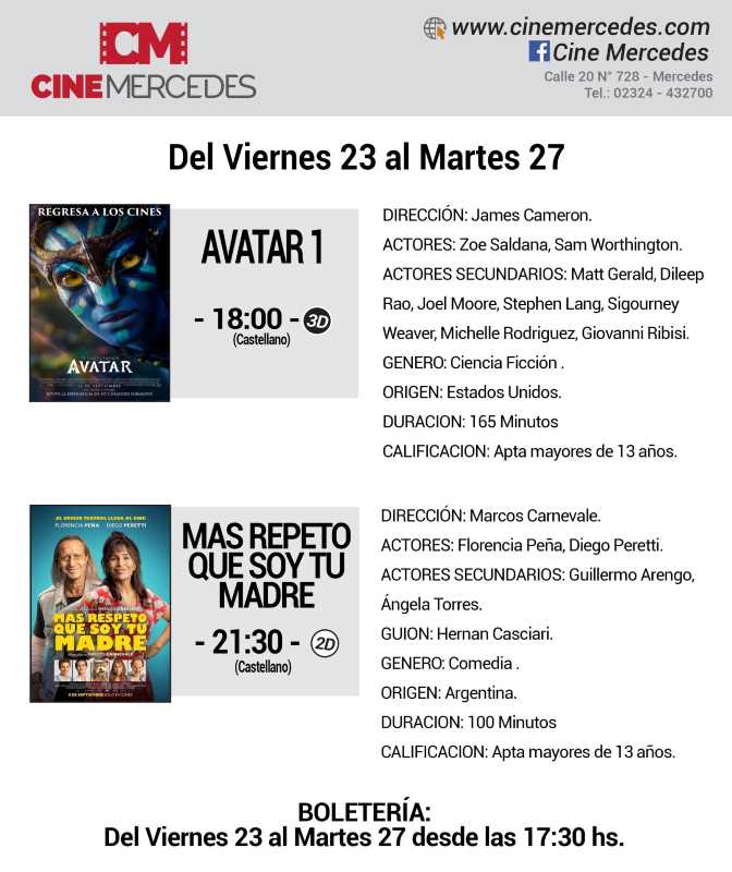 Desde el viernes 23 al martes 27 de septiembre, el Cine Mercedes continúa con la proyección de «Más Respeto que soy tu Madre» – la película filmada en Mercedes en 2021 – y presenta en la gran pantalla la primera parte de «Avatar». El reestreno anticipa lo que será la secuela a estrenarse en diciembre. Las entradas se pueden comprar anticipadas.