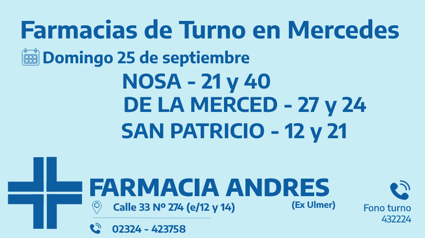 Desde las 8:30 del día de hoy hasta la misma hora de mañana, las farmacias de turno en Mercedes son: Nosa, De la Merced y San Patricio.