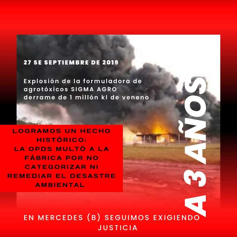 «Hoy, a tres años del desastre sociambiental, seguimos pidiendo lo mismo que el primer día. Urgente categorización y remediacion de la contaminación existente y confirmada, en un hito histórico, por la mismísima OPDS (actualmente parte del Ministerio de ambiente de la provincia de Bs.As), de un derrame de agrotoxicos terminados y materia prima de 1millon de kg/litros. Dicho esto por la mismísima empresa Sigma Agro S.A en sede judicial.