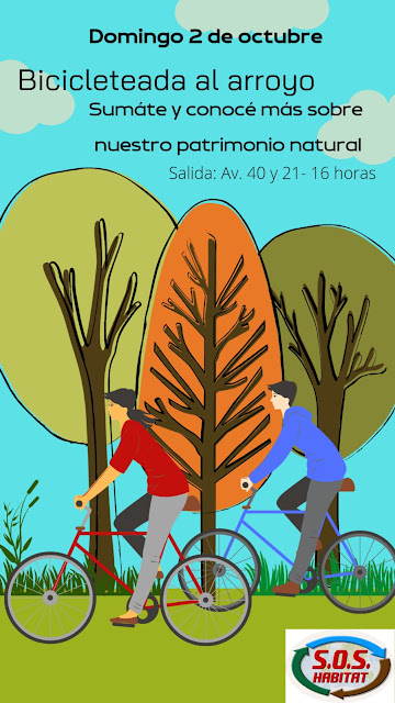 Desde la Asociación Civil S.O.S. Hábitat anunció una próxima actividad. Se trata de una bicicleteada para llegar al Arroyo Frías, patrimonio natural de nuestro partido. La invitación es para el domingo 2 de octubre, 16 horas, saliendo desde la Avenida 40 y su intersección con calle 21. Recomiendan llevar agua , gorro, protector solar y mate.