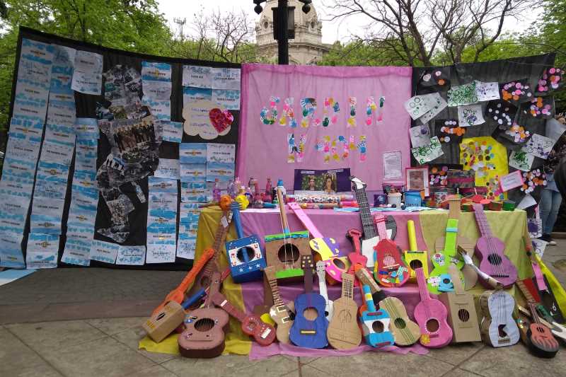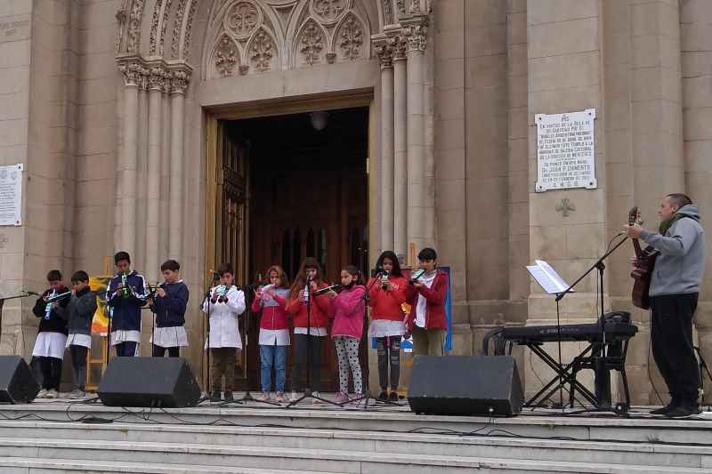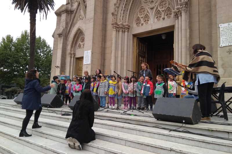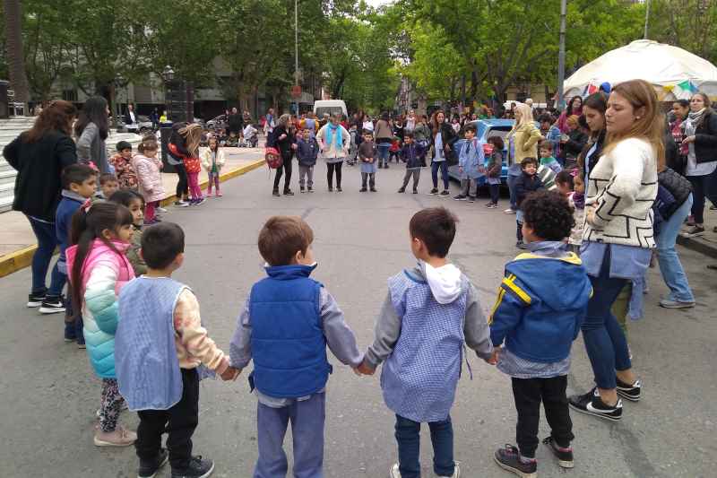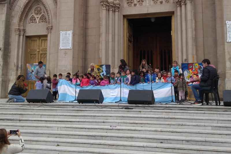 Alrededor de la Plaza podía verse actividades de artes plásticas, mientras que la música y el baile llegaba desde la Catedral. Un coro de jardines de infantes y primarias se escuchó previo al acto protocolar de la actividad con la autoridades educativas y municipales.
