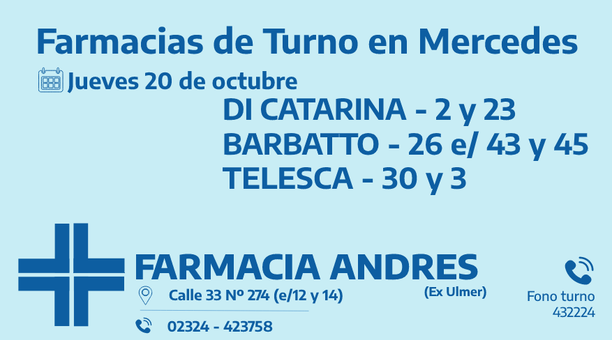 Desde las 8:30 del día de hoy hasta la misma hora de mañana las farmacias de turno en Mercedes son: DiCatarina, Barbatto y Telesca.