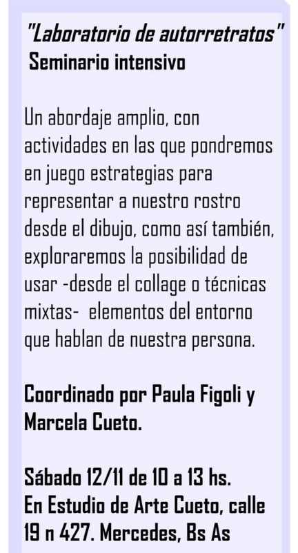 El Estudio de Arte Cueto anunció que el venidero 12 de noviembre llevará adelante un Seminario Intensivo a cargo de Marcela Cueto y Paula Figoli. Bajo el título «Laboratorio de Autorretratos», la capacitación de tres horas trabajará diferentes aspectos y técnicas de los retratos y autorretratos.