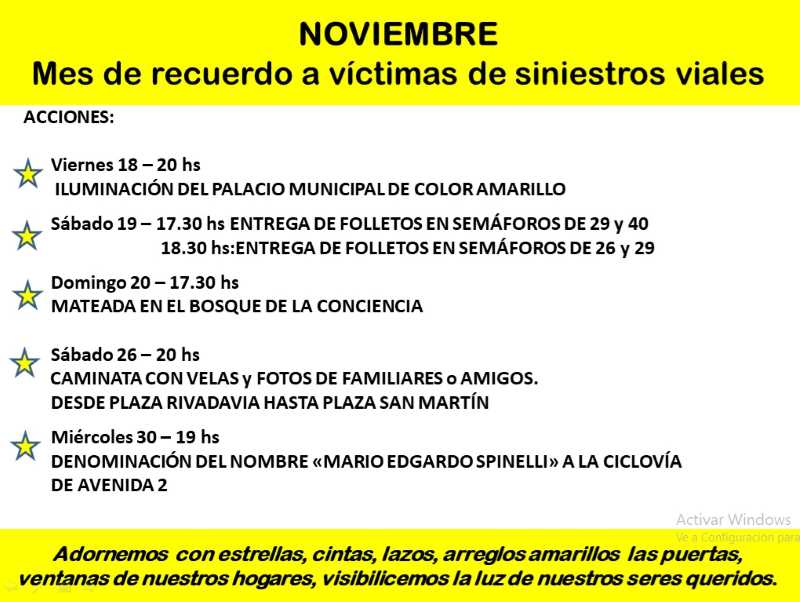 Desde el Grupo Estrellas Amarillas Mercedes acordaron una serie de actividades para recordar a las personas que fallecieron como consecuencia de siniestros viales. El viernes 18 arrancarán los actos acompañando la iluminación en amarillo del Palacio Municipal y durante el fin de semana entregarán folletos para concientizar en prevención en siniestros viales.