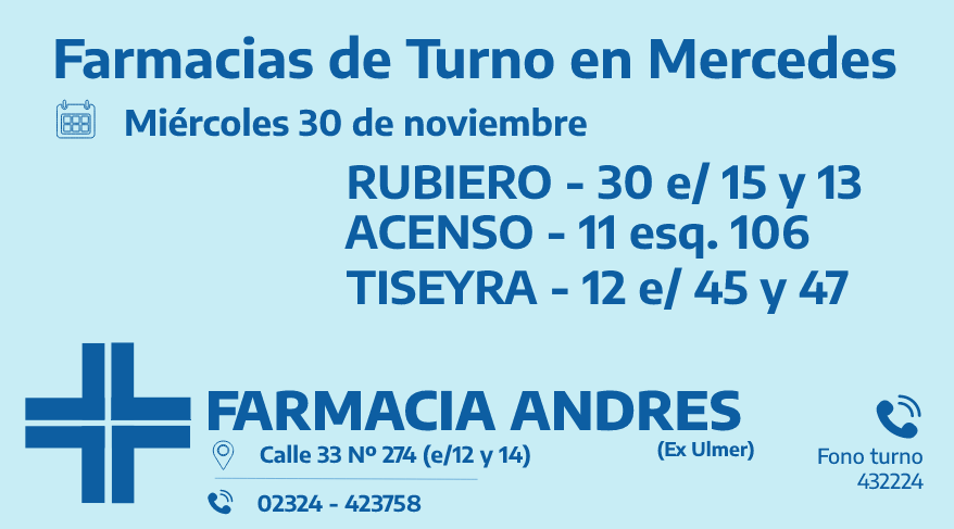 Desde las 8:30 del día de hoy hasta la misma hora de mañana, las farmacias de turno en Mercedes son: Rubiero, Acenso y Tiseyra.