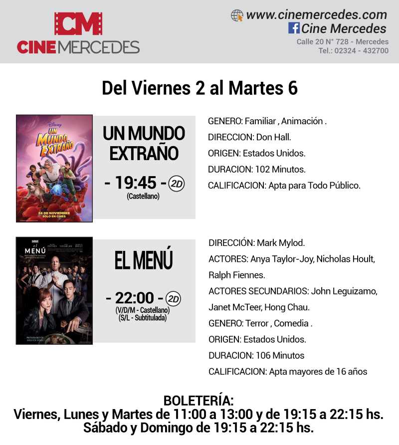 Desde el viernes 2 hasta el martes 6 de diciembre, el Cine Mercedes presenta dos películas. En la función de las 19:45 hs, continúa «Un Mundo Extraño», mientras que a la hora 22 se proyectará «El Menú».