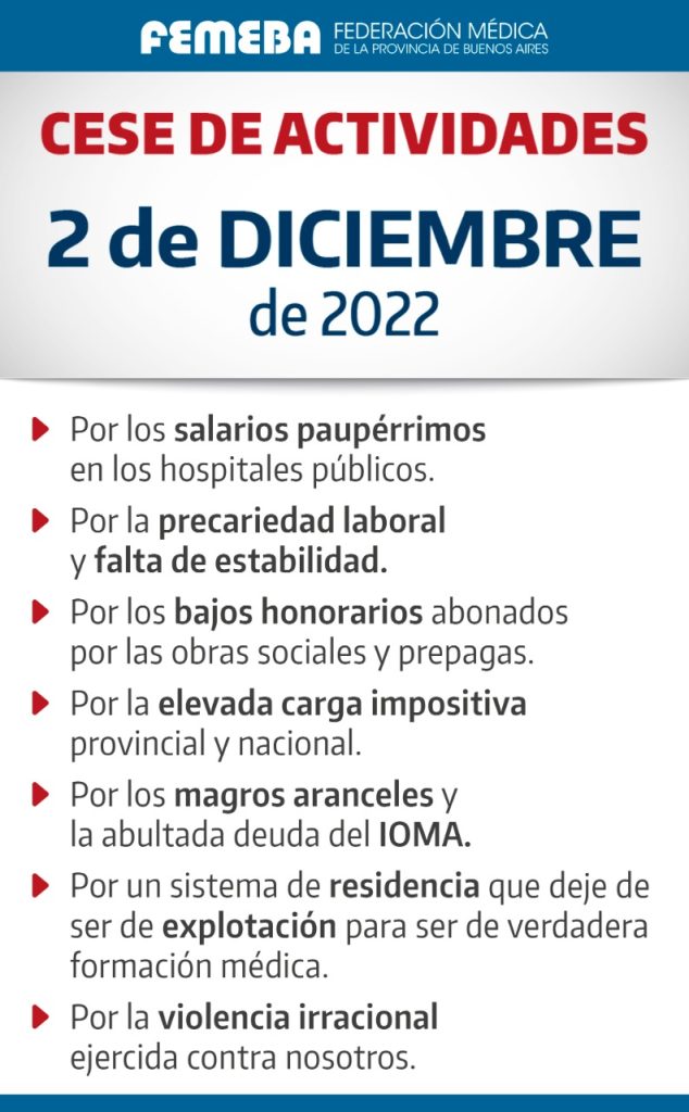 “El desánimo y la frustración nos invade y el éxodo de profesionales es incesante. Ya son muchas las especialidades en las que ningún médico asiste a los pacientes de obras sociales ni prepagas, y en algunas zonas ya resulta imposible conseguir especialistas aún abonando en forma particular”, añadieron los médicos de FEMEBA y advirtieron: “Con salarios por debajo del nivel de la pobreza y con honorarios míseros, pronto nos quedaremos sin médicos, aun en especialidades básicas como la pediatría”.
