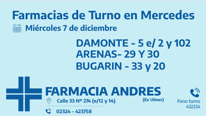 Desde las 8 30 del día de hoy hasta la misma hora de mañana las farmacias de turno en Mercedes son: Damonte, Arenas y Bugarín