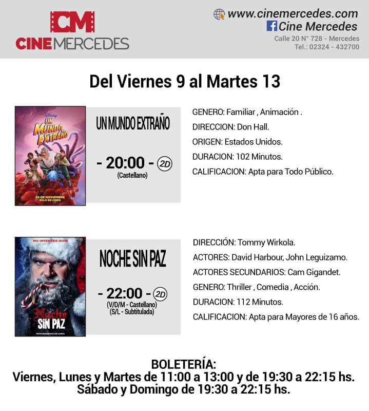 Dos películas para el fin de semana en el Cine Mercedes. Desde el viernes 9 al martes 13 de diciembre proyectan: Un Mundo Extraño (20 horas) y Noche Sin Paz (22 horas.