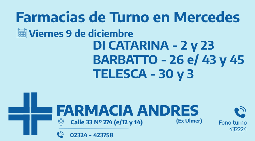 Desde las 8 30 del día de hoy hasta la misma hora de mañana las farmacias de turno en Mercedes son DiCatarina, Barbatto y Telesca.