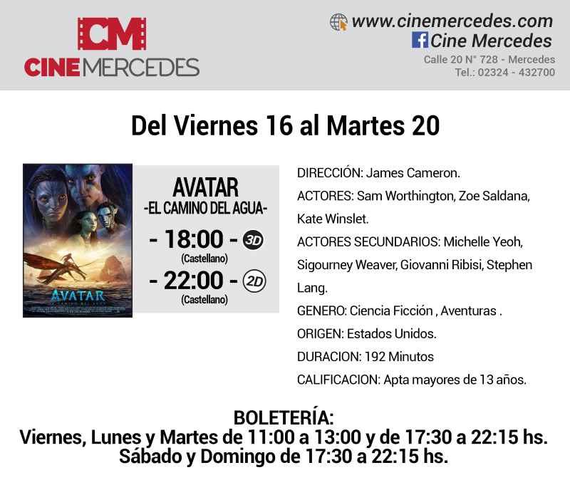 La segunda parte de la película icónica Avatar se estrenó en los cines de todo el mundo. El Cine Mercedes no será la excepción. Entre el viernes 16 y el martes 20 de diciembre, podrá verse «Avatar 2 El Camino del Agua» en las funciones de las 18 y 22 horas.