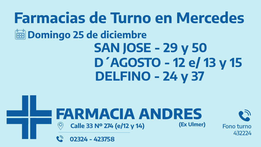 Desde las 8:30 del día de hoy hasta la misma hora de mañana, las farmacias de turno en Mercedes son: San José, D’Agosto y Delfino.