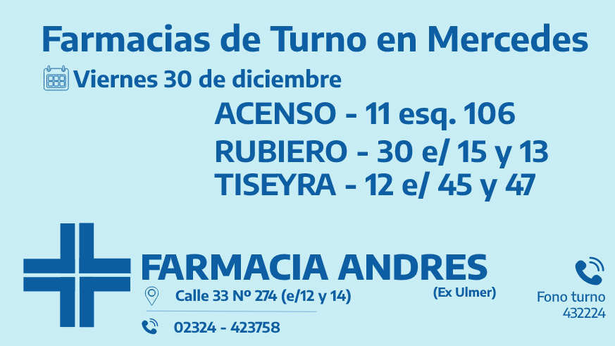 Desde las 8:30 del día de hoy hasta la misma hora de mañana, las farmacias de turno en Mercedes son: Acenso, Rubiero y Tiseyra.