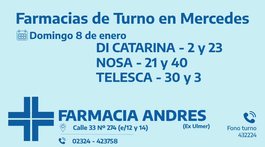 Desde las 8:30 del día de hoy hasta la misma hora de mañana, las farmacias de turno en Mercedes son: Di Catarina, Nosa y Telesca.
