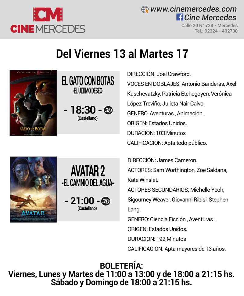 El Cine Mercedes continúa con la proyección de dos películas esperadas por el público gustoso de la animación y los efectos en digital. El Gato Con Botas se puede ver en las funciones de las 18:30; mientras que «Avatar El Camino del Agua» regresa a la pantalla local en las funciones de la hora 21.
