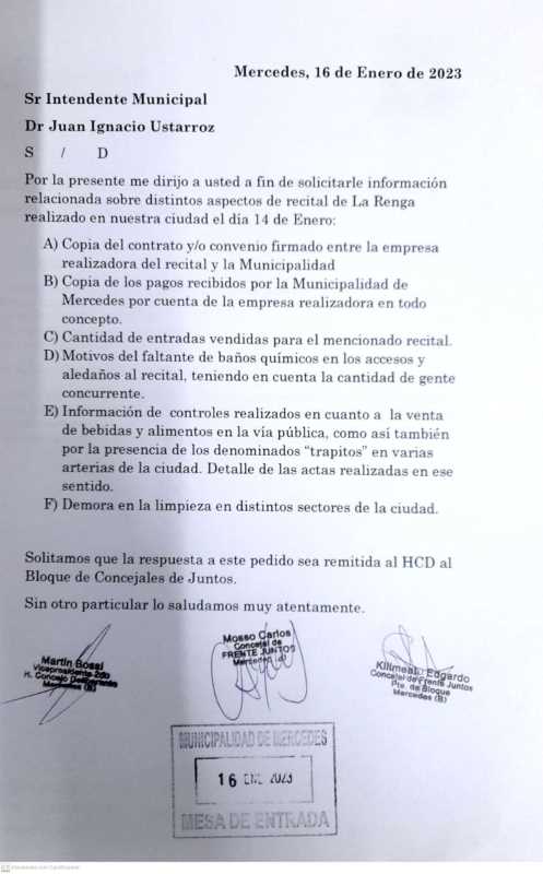 Con las firmas de los Concejales Edgard Kilmeatte, Carlos Mosso y Martín Bossi, del bloque Juntos del HCD Mercedes, se presentó un pedido de informe dirigido al Intendente Municipal Juan Ignacio Ustarroz tras el recital de La Renga realizado el pasado sábado 14 de enero.
