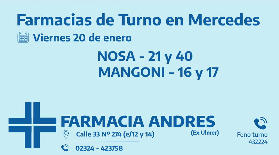 Farmacias de turno del viernes 20 de enero 20 enero, 2023Desde las 8:30 del día de hoy hasta la misma hora de mañana, las farmacias de turno en Mercedes son: Nosa y Mangoni.Comparte esto: Haz clic para compartir en WhatsApp (Se abre en una ventana nueva) WhatsApp Haz clic para compartir en Telegram (Se abre en una ventana nueva) Telegram Haz clic para compartir en X (Se abre en una ventana nueva) X Haz clic para compartir en Facebook (Se abre en una ventana nueva) Facebook TE PUEDE INTERESARCOMENTARIOS Comentarios