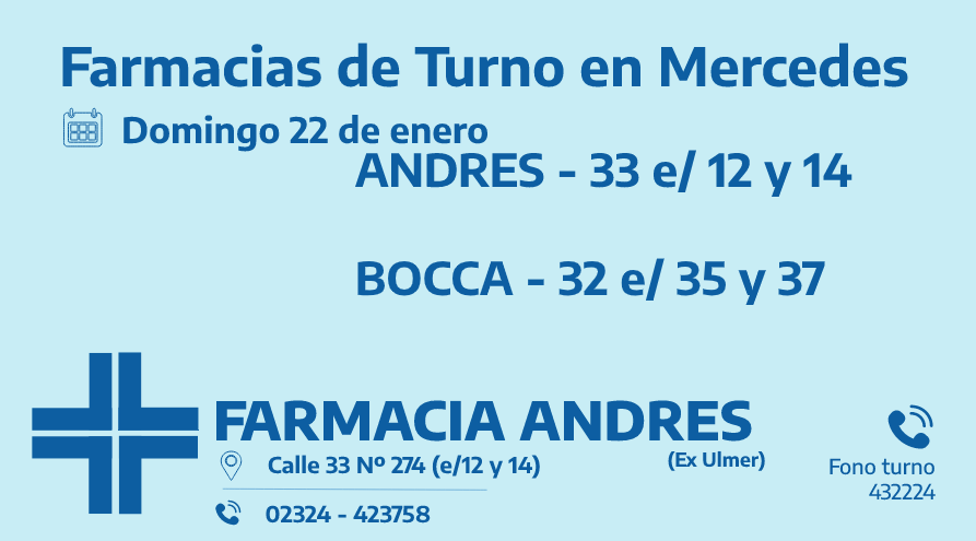 Farmacias de turno del domingo 22 de enero 22 enero, 2023Desde las 8:30 del día de hoy hasta la misma hora de mañana, las farmacias de turno en Mercedes son Andrés y Bocca.Comparte esto: Haz clic para compartir en WhatsApp (Se abre en una ventana nueva) WhatsApp Haz clic para compartir en Telegram (Se abre en una ventana nueva) Telegram Haz clic para compartir en X (Se abre en una ventana nueva) X Haz clic para compartir en Facebook (Se abre en una ventana nueva) Facebook TE PUEDE INTERESARCOMENTARIOS Comentarios
