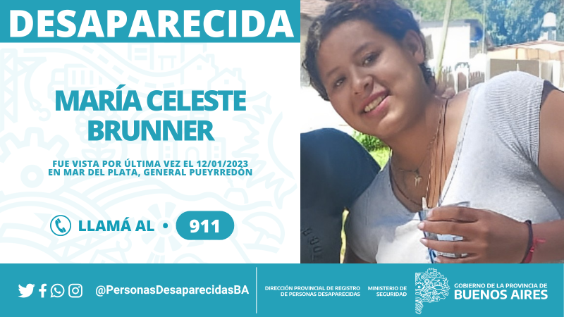 Desde la Dirección Provincial de Registro de Personas Desaparecidas, solicitan ayuda para encontrar a María Celeste Brunner. Con 18 años, fue vista por última vez el 12 de enero de 2023 en la ciudad de Mar del Plata, partido de General Pueyrredón.
