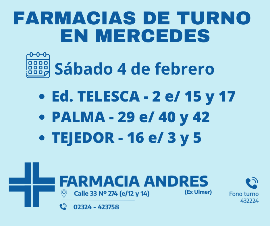 Desde las 8:30 del día de hoy hasta la misma hora de mañana, las farmacias de turno en Mercedes son: Eduardo Telesca, Palma y Tejedor.