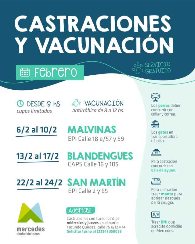 La Municipalidad de Mercedes anunció el programa anual de vacunación antirrábica, desparasitación y castración de perros y gatos en los barrios.