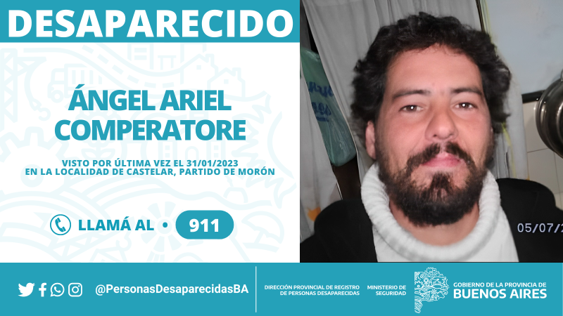 La Dirección Provincial de Registro de Personas Desaparecidas lanzó la búsqueda de Ángel Ariel Comperatore. Ángel, de 49 años, fue visto por última vez el 31 de enero de 2023, en la ciudad de Castelar, partido de Morón.