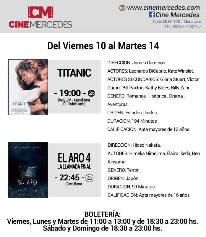 El Cine Mercedes reestrenará la película Titanic. Tal como lo hizo en 1997, la película múltiples premios, se presenta en la pantalla grande local, en esta oportunidad en 3D para disfrutar de los efectos especiales del hundimiento del histórico barco. Las funciones son a la hora 19, desde el viernes 10 hasta el martes 14. También proyectarán «El Aro 4. La llamada Final» en las funciones de la hora 22.45.