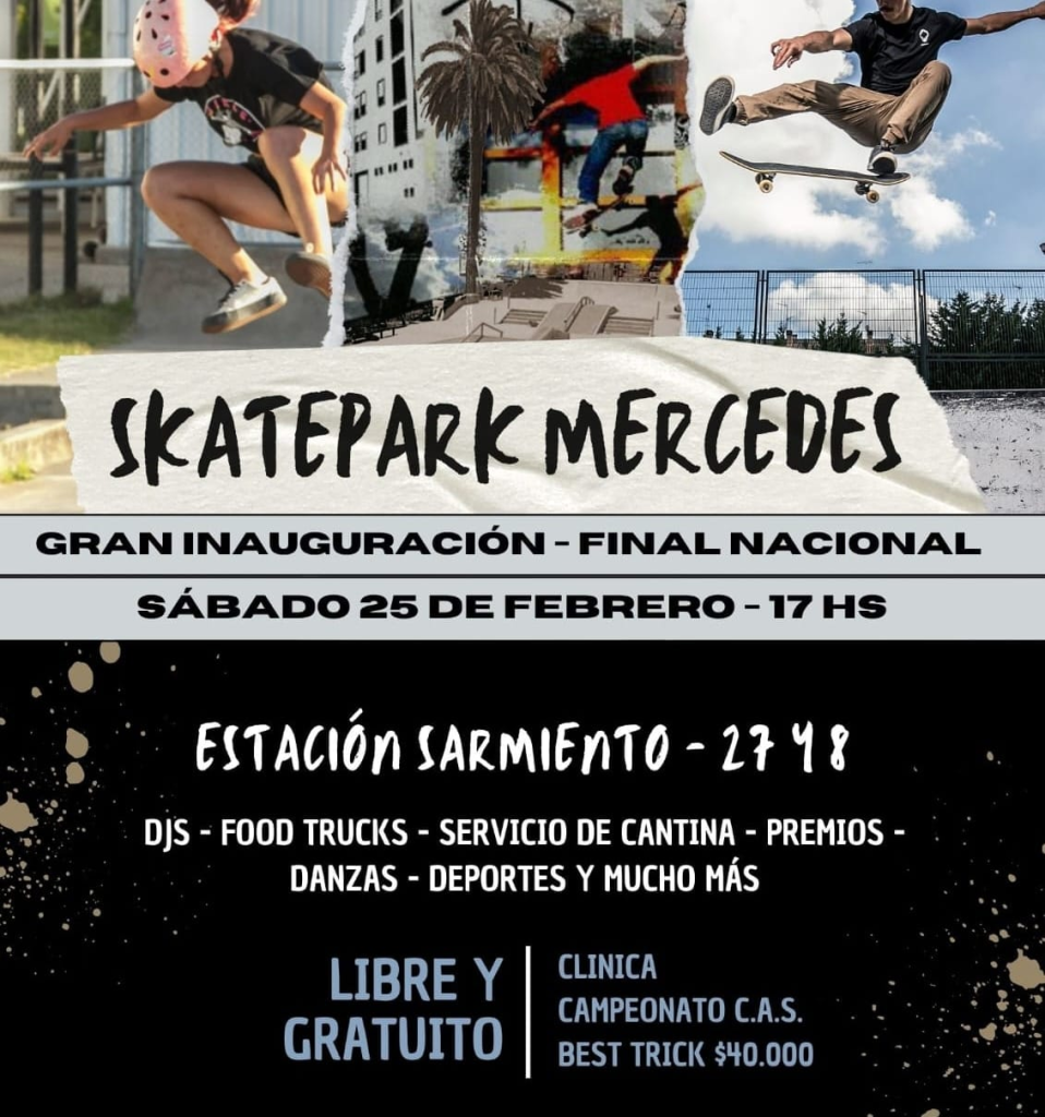 El club de skater anunció que inauguran oficialmente la «Skatepark» construida por el Municipio de Mercedes. En el acto se hará el «bautismo» y los skater locales son los anfitriones de la Final de la Copa Argentina de Skateboarding de la cual participarán más de 50 skater de todo el pais. Asimismo, contaremos con una clínica y torneo Best Trick para todos los que deseen participar.