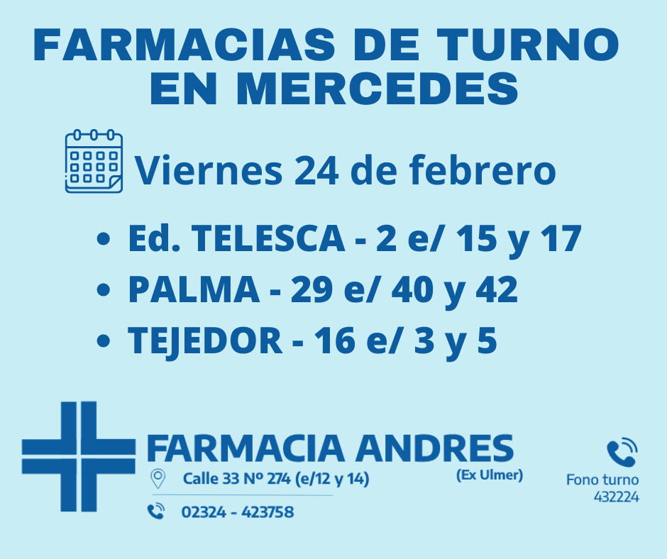 Desde las 8:30 del día de hoy hasta la misma hora de mañana, las farmacias de turno en Mercedes son: Eduardo Telesca, Palma y Tejedor