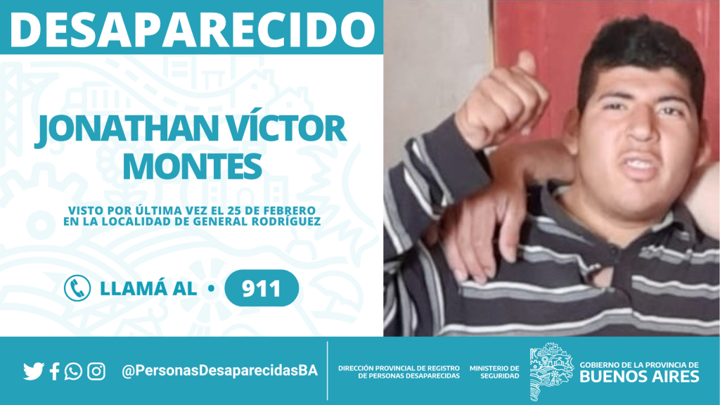 Desde la Dirección Provincial de Registro de Personas Desaparecidas difunden la búsqueda de Jonathan Víctor Montes. De 22 años, fue visto por última vez el 25 de febrero de 2023 en la ciudad de General Rodríguez.