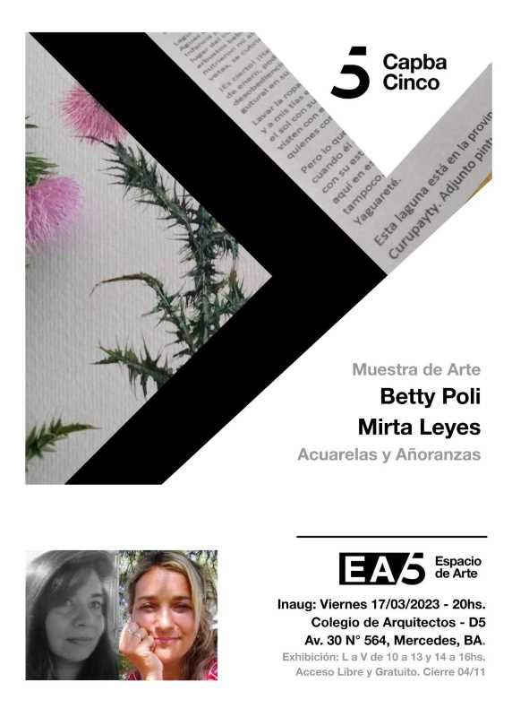 Quienes expondrán serán las artistas Betty Poli y Mirta Leyes con su muestra titulada “Acuarelas y añoranzas. Las disciplinas que integran la muestra son Acuarelas y Escritos.