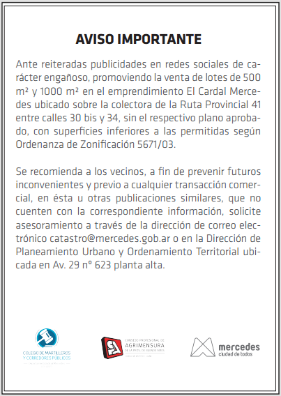 «Ante reiteradas publicidades en redes sociales de carácter engañoso, promoviendo la venta de lotes de 500 m² y 1000 m² en el emprendimiento El Cardal Mercedes ubicado sobre la colectora de la Ruta Provincial 41 entre calles 30 bis y 34, sin el respectivo plano aprobado, con superficies inferiores a las permitidas según Ordenanza de Zonificación 5671/03.