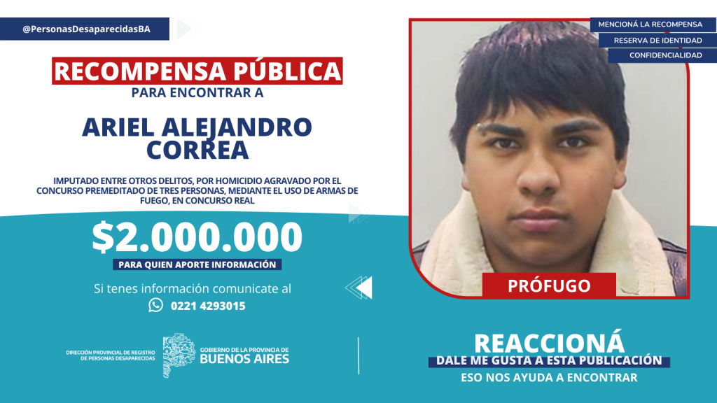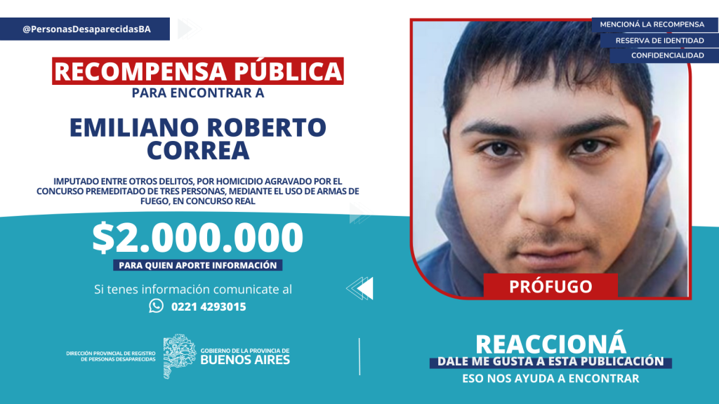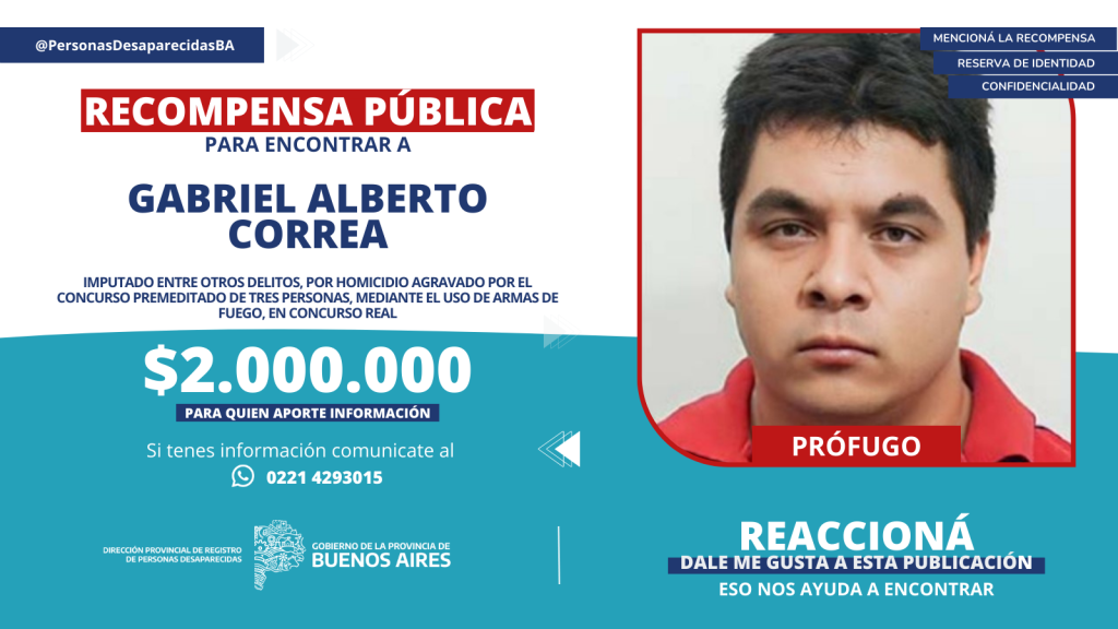 Desde la Dirección Provincial de Registro de Personas Desaparecidas de la provincia de Buenos Aires hicieron pública la oferta de recompensa ante la búsqueda de los hermanos Correa. Gabriel Alberto Correa, de 31 años; Ariel Alejandro Correa, de 29 años y Emiliano Roberto Correa, de 25 años, son buscados por delitos cometidos en la localidad de Florencio Varela.